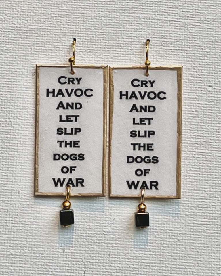 Shakespeare quotation from Julius Caesar. Mark Antony speaks this great line. These look like they’re on metal, but it’s paper, so they’re very light. Trimmed in hematite cubes. 2.5"x1"/6cm x 2 cm